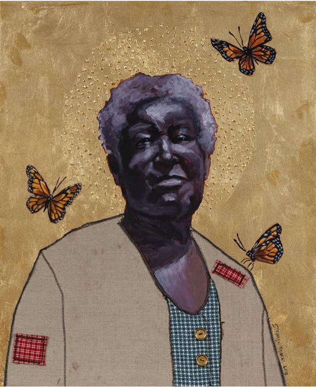 Another artist who I stumbled upon on Instagram is Baltimore’s Stephen Towns. He won the coveted Sondheim Prize in 2018. His most recent work at the Chicago Expo, a series entitled “The Bridge,” is really beautiful – he paints portraits and stories of freed enslaved black people. Appropriating religious iconography and gold backgrounds reminiscent of Byzantine art, he is remaking art and history through his work.