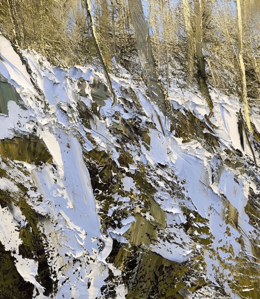 This next artist caught my eye as I was scrolling – Alena Shymchonak. She does a lot of beach paintings, but this one is of lillies. I like her use of impasto (thick paint application), strong vertical and horizontal lines of color, pulling and scuffling, and the balanced composition.