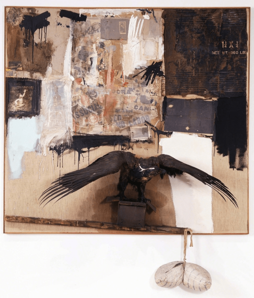 Robert Rauschenberg rejected the angst and seriousness of the Abstract Expressionists, invented of techniques using unconventional art materials ranging from dirt and house paint to umbrellas and car tires. Pictured here are his first three-dimensional collage paintings—he called them Combines—in which he incorporated discarded materials and mundane objects to explore the intersection of art and life. His later artwork includes painting, fabric collage, sculptural components made from cardboard and scrap metal, as well as a variety of image transfer and printing methods.