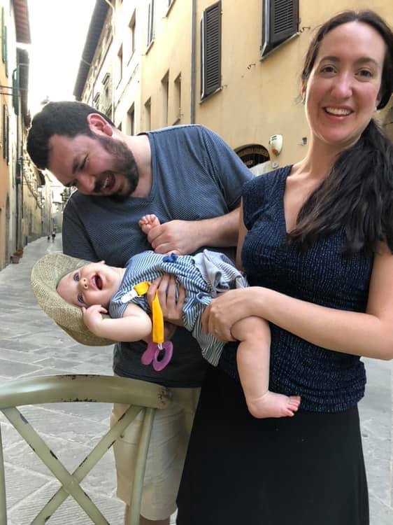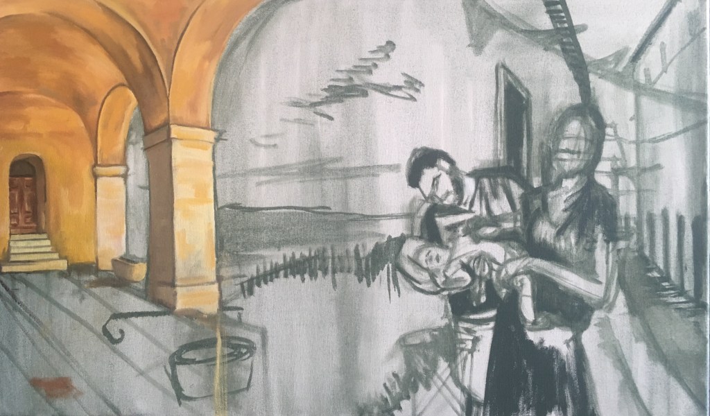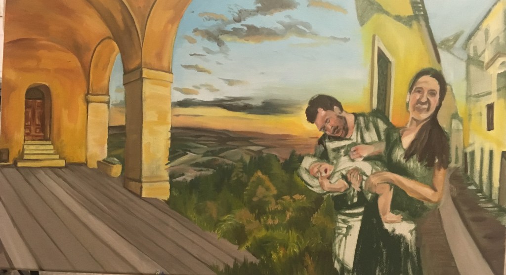 Last year my god-sister, Courtney, had a baby, and her mother commissioned me to paint a portrait to celebrate the first year of Courtney’s motherhood. I had several meetings with Courtney to discuss what she wanted in terms of the mood, colors, message, theme, poses of the figures, etc. We both wanted it to successfully communicate her new family’s joy, love of one another, and love of music. My ART 325 oil painting class helped me solidify and process these ideas with collage. The resulting final composition came from using photos from Courtney’s trip from Italy last summer that reflect her family’s Italian heritage, and her and her husband’s operatic singing practice. Here are some photos of the process: