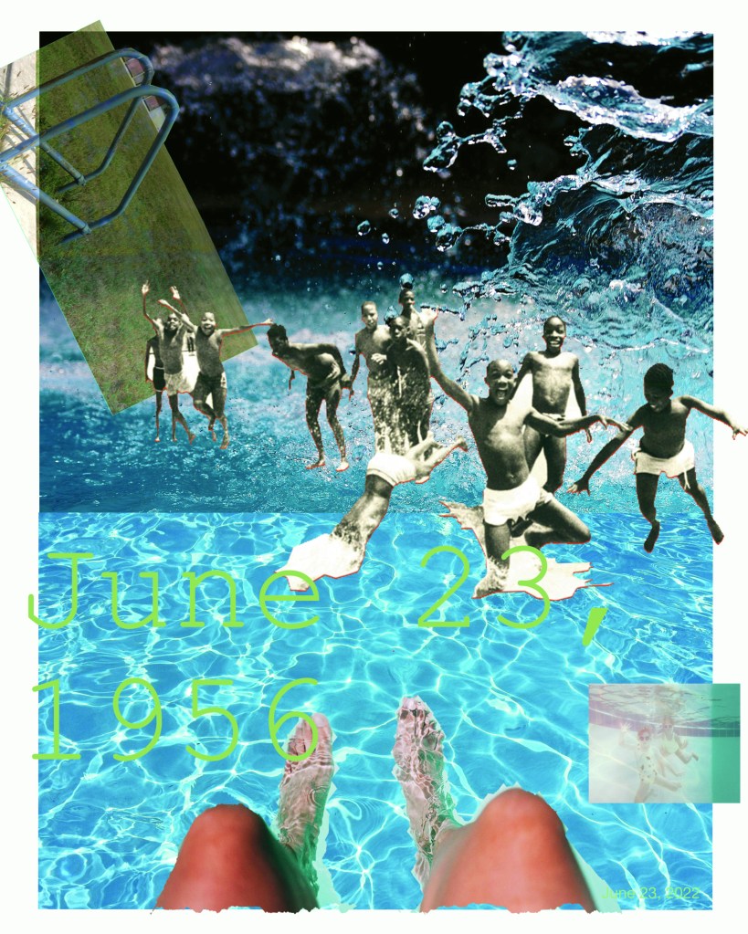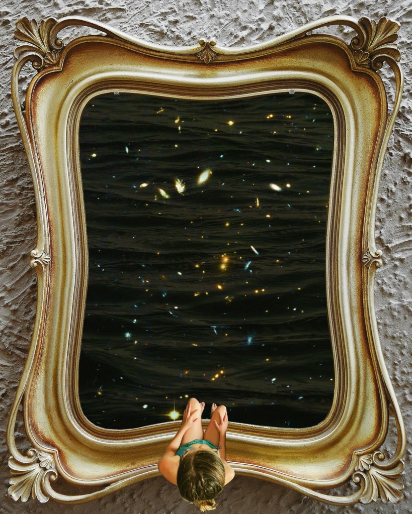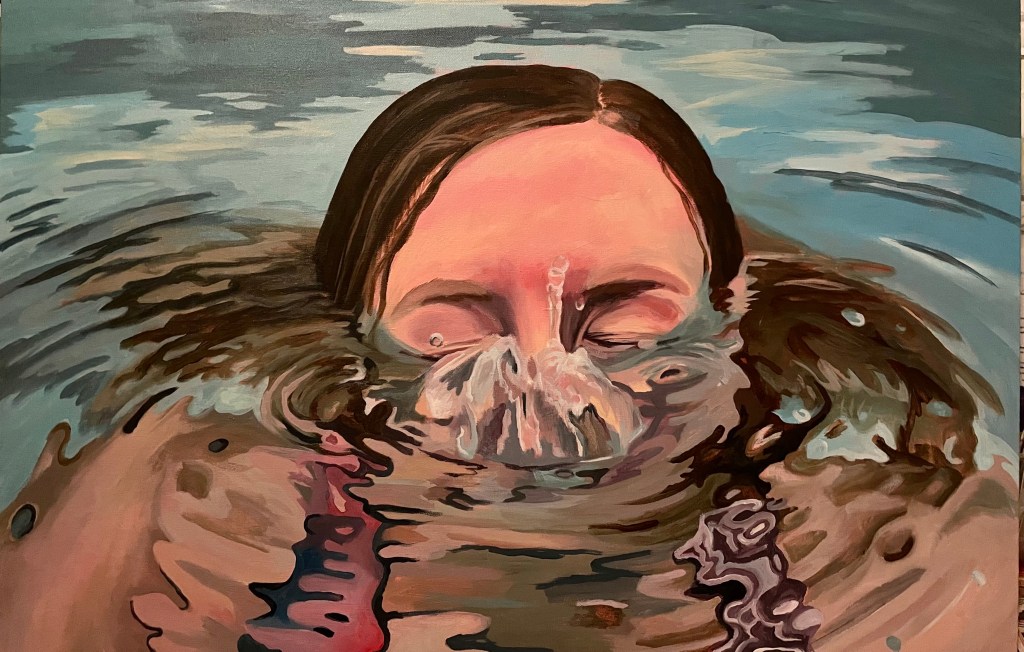 It’s curious to me how water both reflects and distorts light. In watching swimmers, and because the subjects’ faces are masked, we are naturally more curious about both the experiences: Are they enjoying being under the water? What is it like under there? Who are they? How do I feel as I witness another swimming under water? To me these questions and imagery connect with the simulaneous joy and unknowability of the non-dual and non-self nature of direct experience that I also explore in my practice of Buddhist meditation. The color variations, texture, and broad, painterly strokes seek to convey the dreaminess of water that intrigues and entices the viewer to get lost in their color and shape. The intention is for the water to pull the viewer into the work and also convey a similar wavy, dreamlike, pleasant experience of submerging below the surface. I am also exploring non-duality, immateriality, immersion, and direct experience in my artworks and am inspired by how these themes have throughout art history frequently called to artists to explore in their imediate experience in various mediums. The work is about looking into the void and exploring the actual and symbolic surface texture of experience on both personal and literal universal levels. I want to engage the viewer so they are encouraged and supported to examine and imagine their own experience with self-awareness. I utilize a collage of frames and perspectives that forces the viewer to reconsider their local relative and ultimate location and identity in space and time.