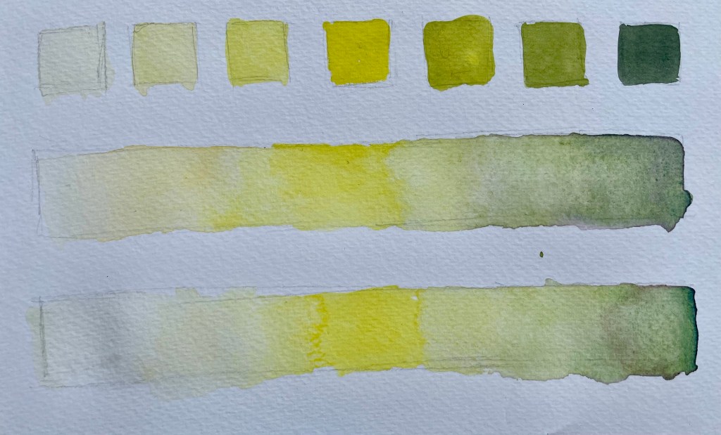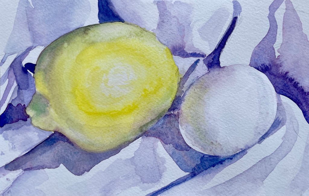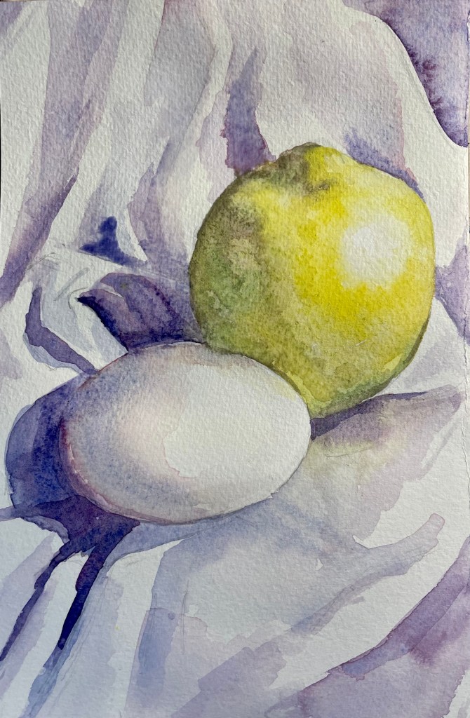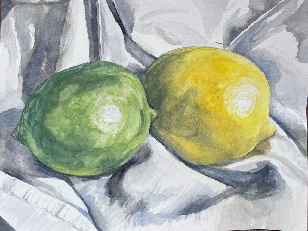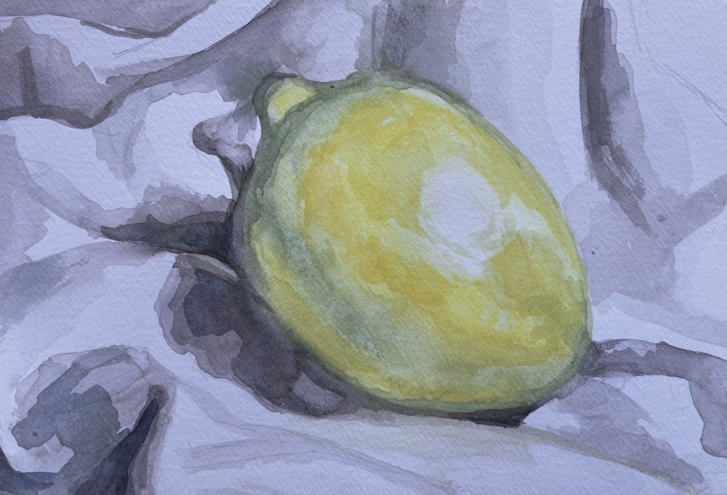 Above is all the work I did for the class. You may notice that the class was extremely well scaffolded. 1) We started off with learning the basic skills of mixing ultramarine blue and sepia to make a neutral black, and then worked on painting smooth gradients in wet-on-wet and dry-on-wet techniques. 2) When we mastered that, we then added one color – yellow – to learn how to produce shadows in lemons. 3) We then added more fruit, again using the color wheel to practice dulling complements of new colors. 4) Next, we explored texture my developing saturation and details in the midtowns. 5) Finally we explored pushing the sense of space and atmospheric perspective with deeper still life set-ups and landscapes. It was such a blast! I honestly didn’t know anything about watercolor before the class, but feel really confident at it now.