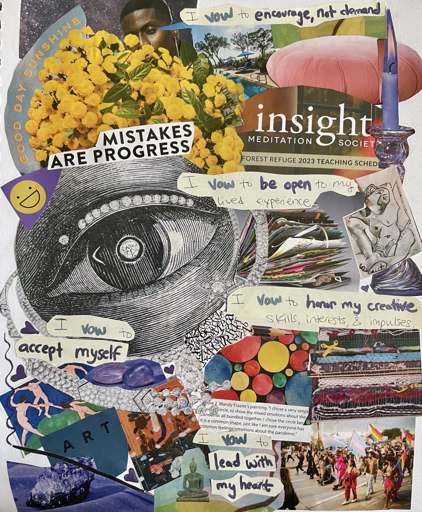 One workshop by Unique Robinson, a Professor at MICA, artist, and educator, combined reflective writing, collage, and mindfulness to guide us to create “Vows and Vision Boards.” My art was inspired by my vow to treat myself and my students more gently, to encourage myself to be open to life, art, and my own heart. Check out the final version below. If you’re interested in teaching this in your classroom, you can download a copy of her Power Point slides here: