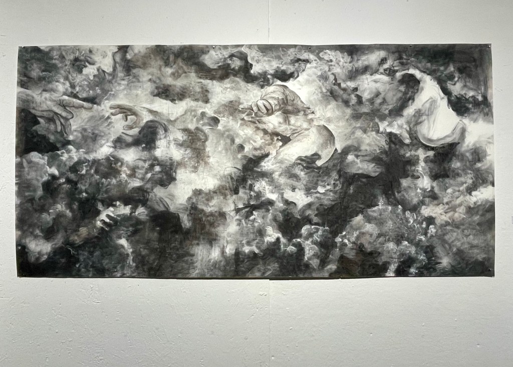 His artwork uses bold expressions of color – ranging from swirling lines to weighty blocks – to create large abstract paintings that remind the viewer of atmospheres, clouds, and landscapes. At the show, Zachary talked to us how his experiences as a kid, gazing in the clouds, inspired this work. He enjoys the play of seeing things that may or may not be there, and the way the painting can continually reveal images and forms to everyone, including the artist. He often does not have a plan for what he wants the painting to look like, but rather embraces the spontaneity of intuition. He also explained that the music he listens to in his studio during painting sessions has a large impact on the feeling and emotional tone of the work. For me, the beauty of his work is not only the scale, the color, and the movement, which is obviously stunning, but the way it invites the viewer to gaze into itself and discover something new.
