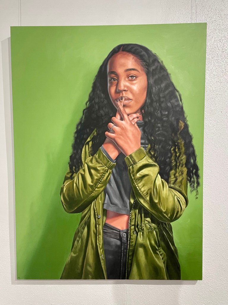 Most of the paintings in the solo show depict the duality of Ikegwu’s subjects, juxtaposing moments of calm, or seriousness, with times of confidence or joy. Ikegwu’s handling of the oil paint is really remarkable in how she is able to blend the different values of light into the skin tones and fabrics to create a very fluid, smooth feeling radiating from their gazes that match the viewer’s. That gaze is important; it’s very easy to judge someone or assume things based on appearance, so the artists dual-paintings invite the viewer really consider who they are looking at, and what they are trying to reveal in their choice of adornment, pose, facial expressions, etc. The other striking aspect is the bold, monochromatic color scheme in each of the works. The color is so vibrant and playful; it’s clear the artist is inspired by color to help further communicate the subjects inner world and felt sense.