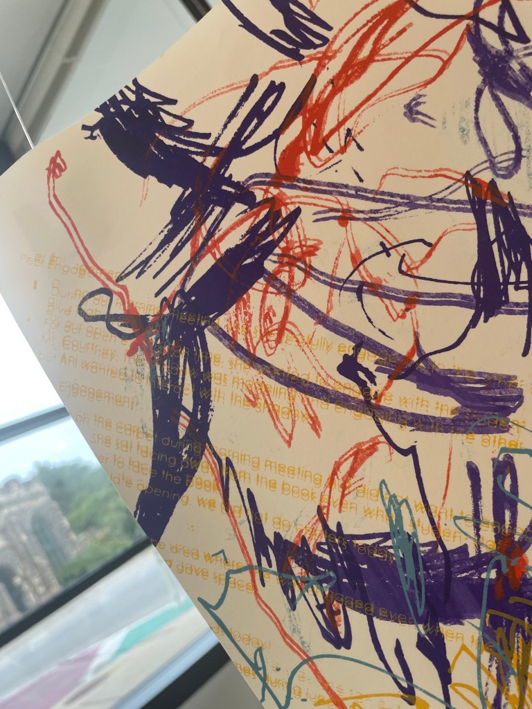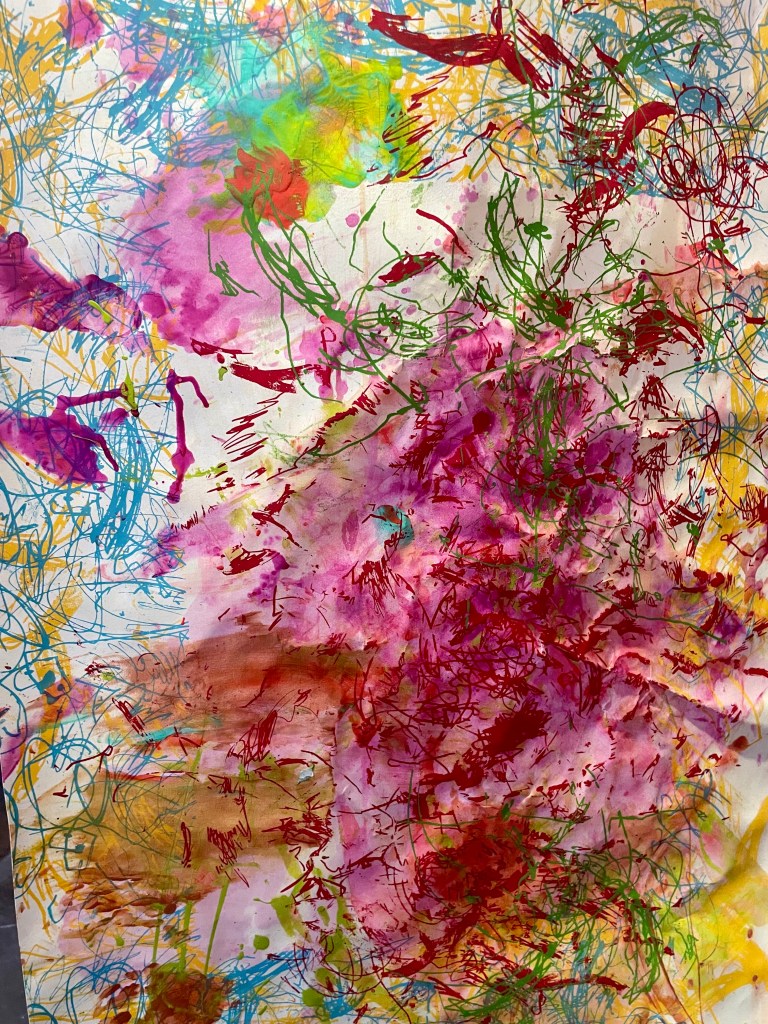Ani is a toddler with Down syndrome, and after talking with Kari, it was clear she had already fought more for her daughter than any parent should have to just to get her into a preschool that could accommodate her special needs. As an art teacher in BCPSS, I know first hand how some of my students with the greatest disabilities, are the most expressive and free when they make art, and it shows it their work. And it shows in Ani and Kari’ work. The paintings are so vibrant, energetic and playful; they immerse you in a world of mark-making, color, and layering. However, the tension the artwork is poignant – the chaos of a system that does not prioritize children with special needs, and having to courageously navigate that as a parent.