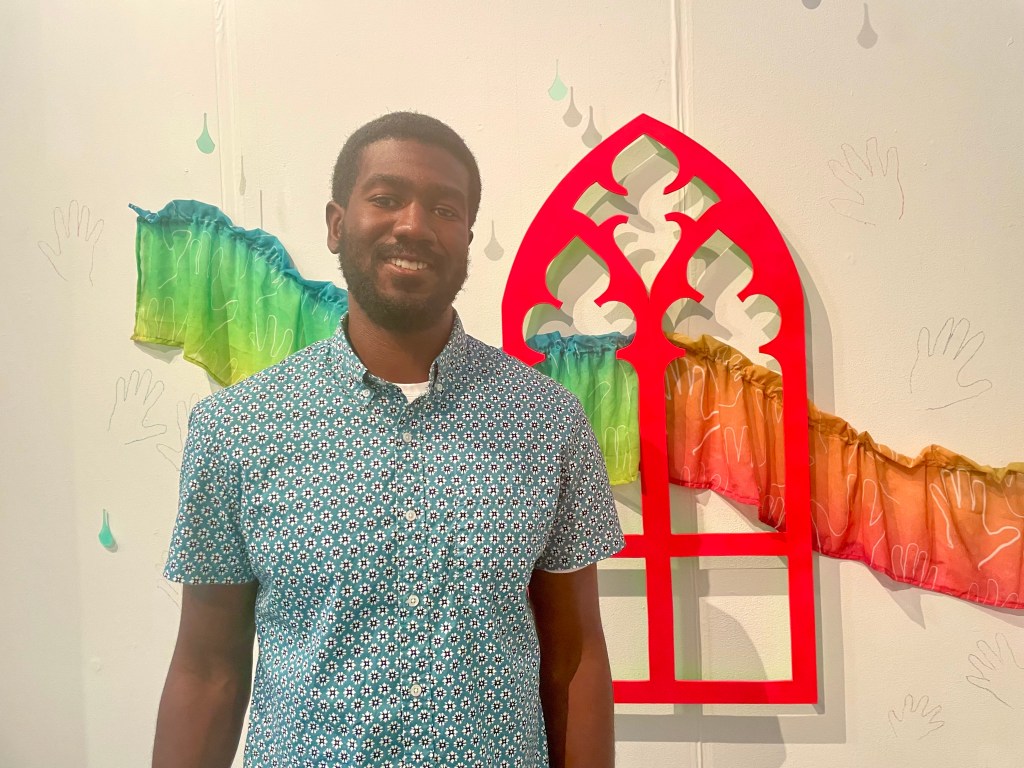 Last but not least is the beautiful installation by Erin Barry-Dutro. Her work is inspired by communities and social systems. She values equity, justice, community, and humility. She is often uses bright and fluorescent colors, LED lights, and holographic materials. Two interesting things about her work is that it she invited folks from the community get their hands outlined on the rainbow fabric and the wall. Secondly, knowing the Feedback Loop Exhibition is in CA Gallery, right next to the Greenmount Cemetery, the bright neon pink architectural focal point is inspired by the cemetery’s stone arches. From the gallery space, looking through the windows, viewers can see these arches! Collapsing time and space, Erin invokes the arches as portals to situate the viewer in a deeper introspection of what it means to be standing in that historic neighborhood. It was meaningful to support other Towson artists and get to connect with them via discussion of their artwork. One of the main benefits of going to an opening or closing reception; you get to speak directly to the artists in the show! The Feedback Loop show is over now, but the show below is still on view.