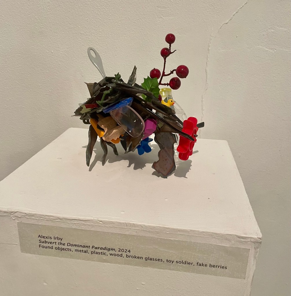 Another artist in the show, Alexis Irby, creates sculptures out of found-objects. Each one is a unique conglomeration of plastic, wooden, and metal objects fused together to create new meaning and form. Irby says in her artist statement, “I highlight the mundane and overlooked parts of life through repurposing post-consumer objects. This brings a sense of absurdity and sometimes humor into my sculptures. My work leaves the audience uncertain of what they are looking at, inviting viewers to examine objects more closely, and to create their own personal meaning.” It’s true – upon looking closer, I found myself playing a sort of “eye-spy” game and pondering what connection the objects had to create a narrative within the work. The work is playful and fun and the detail in the work makes the work feel like you can always find something new within it!