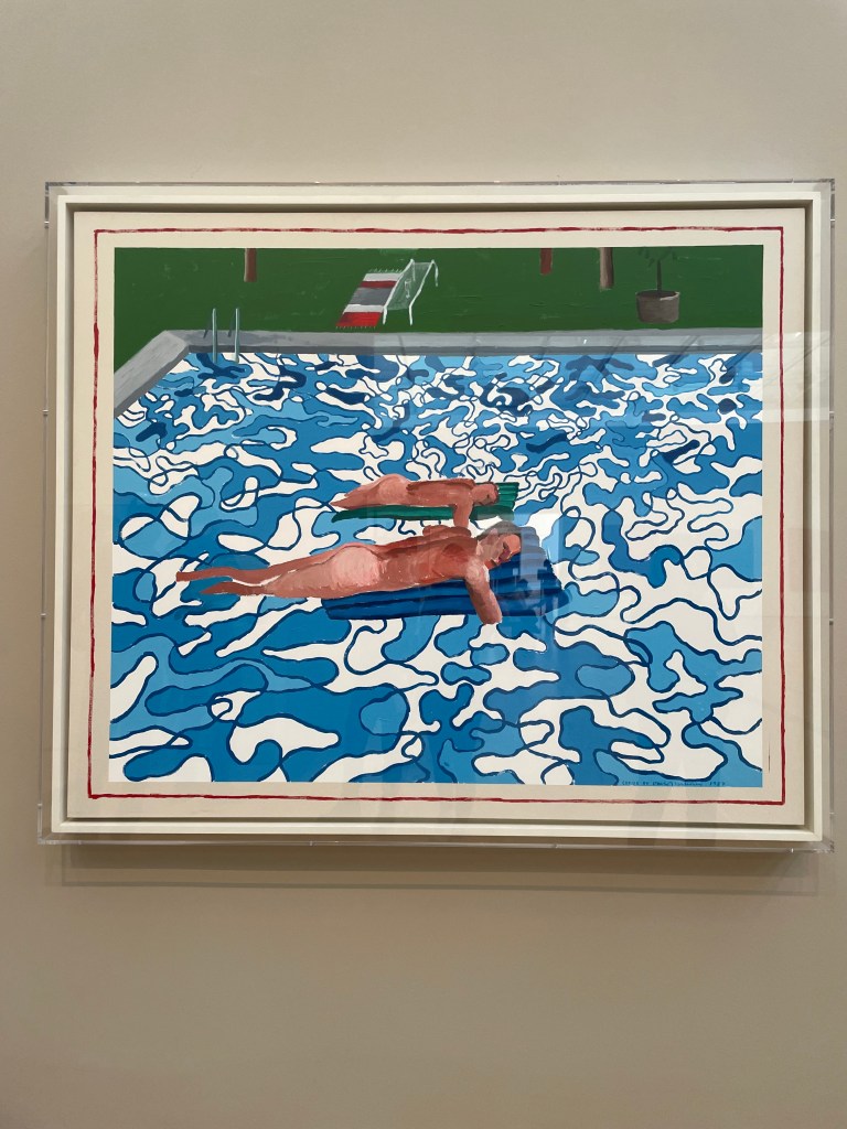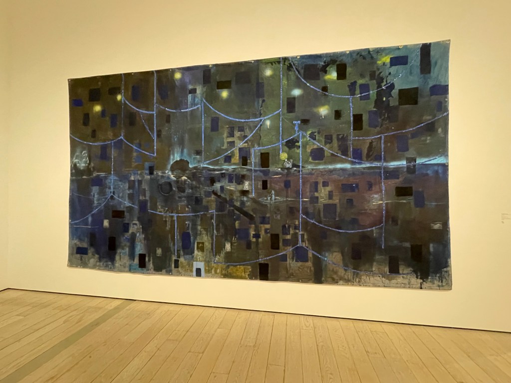 The second painting in the first row depicts a woman swimming underwater. It is titled “The Space in which we Travel.” This artwork is an acrylic on canvas, created in 2019 by Calida Rawles. She is best known for her images of Black subjects swimming in water. She paints them floating, diving, or drifting, relaxing and at ease, often under the water. For Rawles, water signifies both physical and spiritual healing as well as historical trauma and racial exclusion. She uses this duality as a way to create a new space for healing, reimagining her subjects beyond racialized stereotypes. The work comes off as sacred, joyful, and serene. As an artist, I find the beauty and challenge of painting watery scenes captivating. Seeing a successful artist excel in this genre is inspiring. Seeing her work in-person motivates me to continue exploring this motif in my work in my own way.