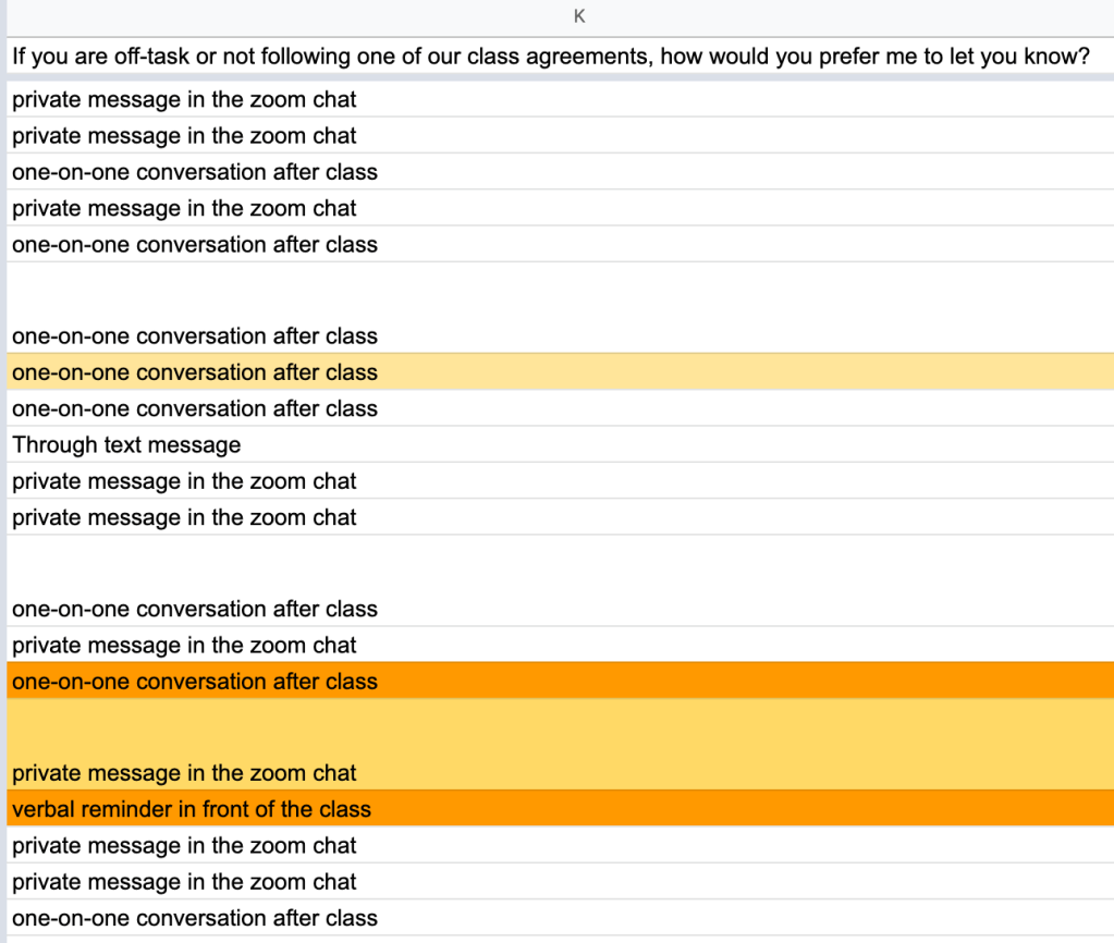 As an effective teacher, when it’s necessary, I appropriately addresses, redirect or de-escalates student misbehavior or disruption, in a manner that solves the issue with minimal disruption to the lesson and student learning. At the start of the year, I asked the students what the preferred method of contact was when they need to be reminded to stay on task. The options included: private message in the zoom chat, a one-on-one conversation after class, verbal reminder, or other. I defer to their chosen methods of communication for the first warning. After that, I escalate my intervention to asking them to stay after class to talk about what is going on. Finally, if the situation is severe, I invite them into a breakout room to discuss what is going on. This 4th option provides the least amount of disruption for all students.