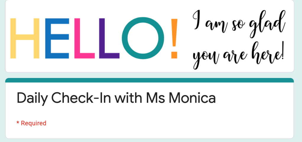 Every Monday we start with sharing how our weekends went, what we did, how we are doing. Students have the option of also private messaging me how they are doing. If we are in an asynchronous class, I have the lesson by filling out a google form to check-in with me, tell me what they need. I also list coping skills for them to try if they are having a bad day.