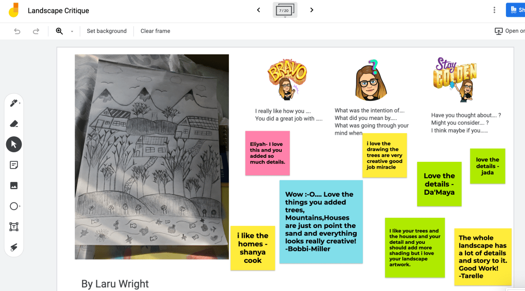 We then engage in critique where students students self-assess though a virtual google platform called Jamboard. This platform allows students leave sticky notes with positive comments to show peer support, ask questions or offer suggestions for areas of improvement. Students support one another through affirmation, encouragement, demonstrated empathy, or other supportive actions. I help facilitate the discussion by elevate insightful comments or asking students deeper questions regarding their comments. We end the critique with a final applause.